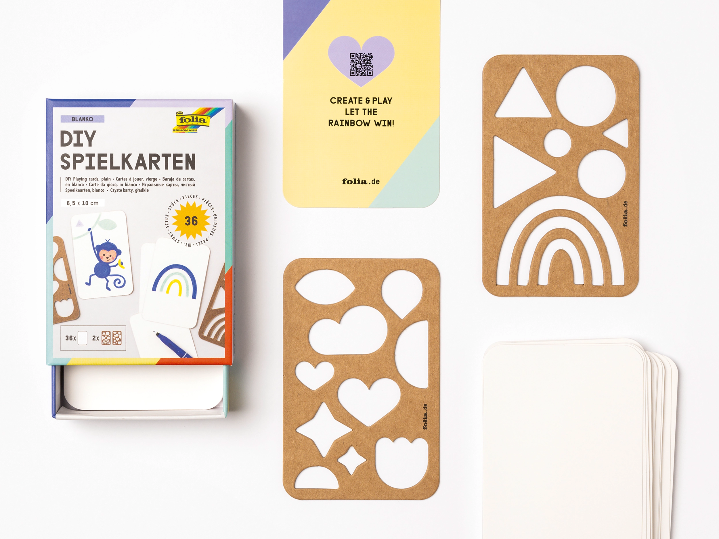Gestalte bis zu 34 Kartenpärchen mit gleichen Motiven, also maximal 17 verschiedene Motive, die du jeweils zweimal aufmalst. Die Karten lassen sich einseitig mit Filzstiften oder Buntstiften bemalen und ganz nach deinem Geschmack verzieren. Die beiden Schablonen helfen großen und kleinen Künstlern dabei, Tiere, Blumen, Herzchen oder Fantasiewesen zu zeichnen. Im PDF „Motivvorlagen Schablone“ findest du zusätzlich witzige Inspirationen für deine eigene Kreativwelt. Nachdem alle doppelten Motive fertig sind, folgt die einzelne Karte mit dem Regenbogen, die Lucky Rainbow Karte. Und schon kann das Spiel beginnen.