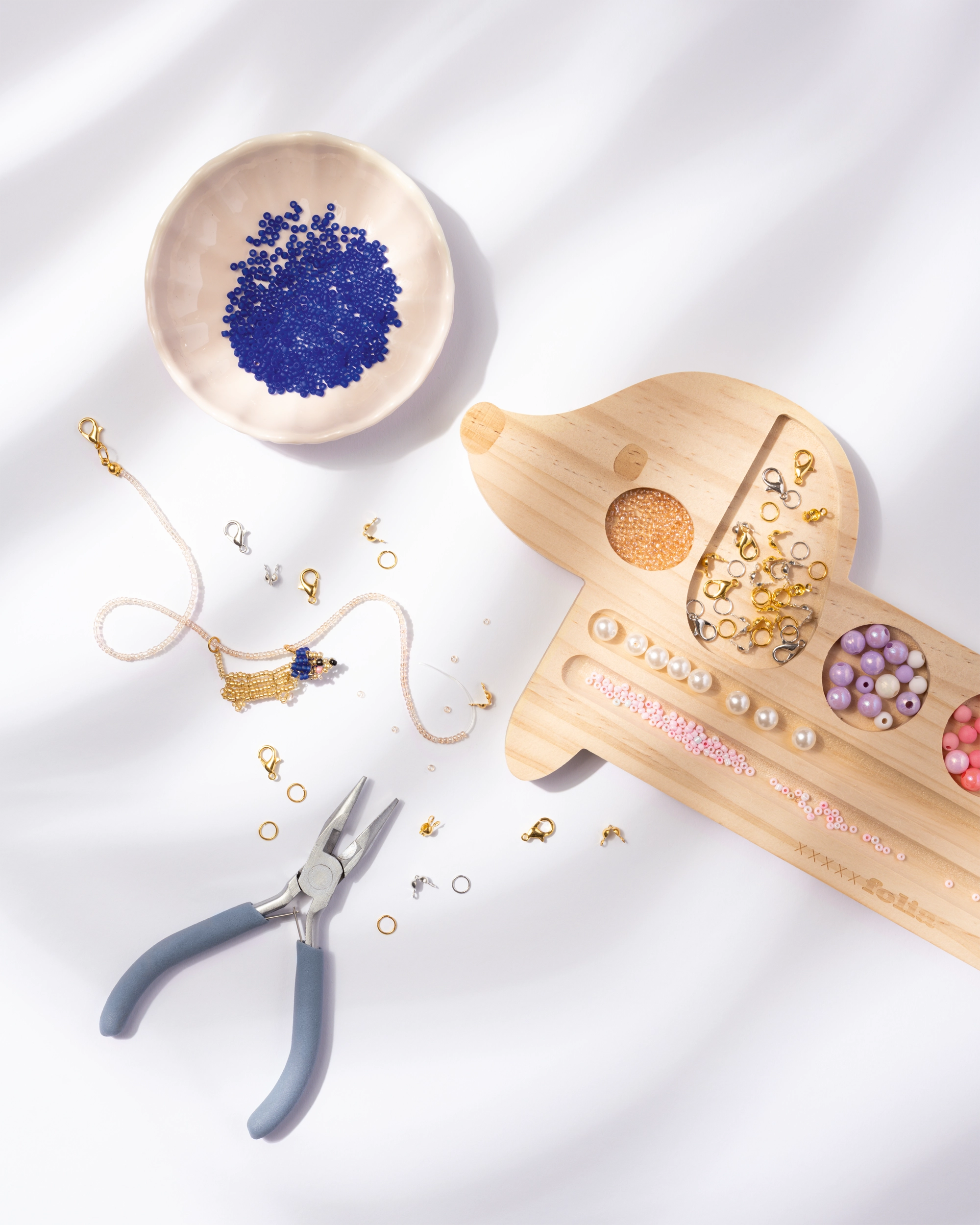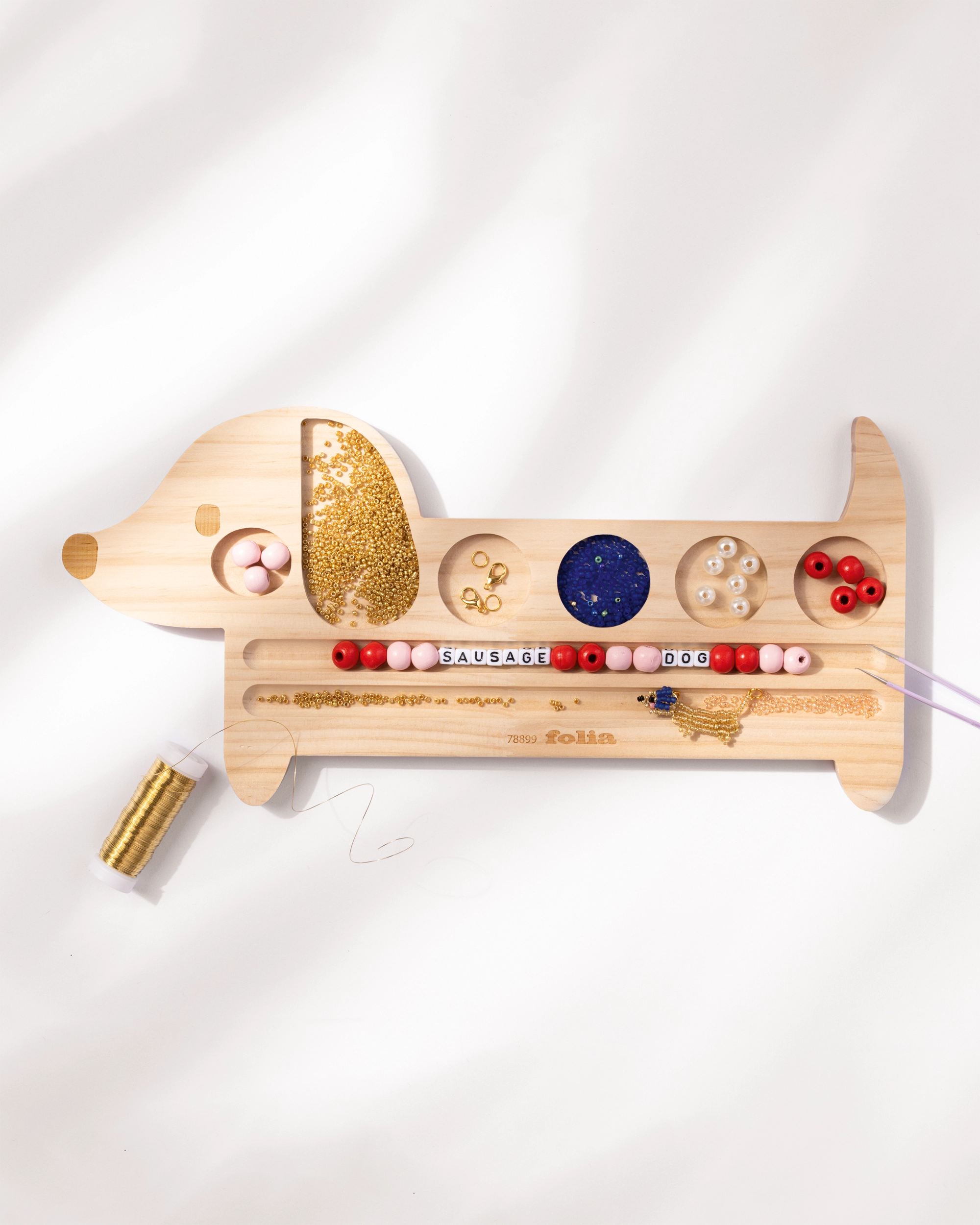 The cute dachshund helps you neatly sort beads, letter beads, strings, and more. Arrange everything in the grooves, plan your design with ease, and when you’re ready, simply thread it all together. Perfect for bracelets, necklaces, and small personalized pieces.
