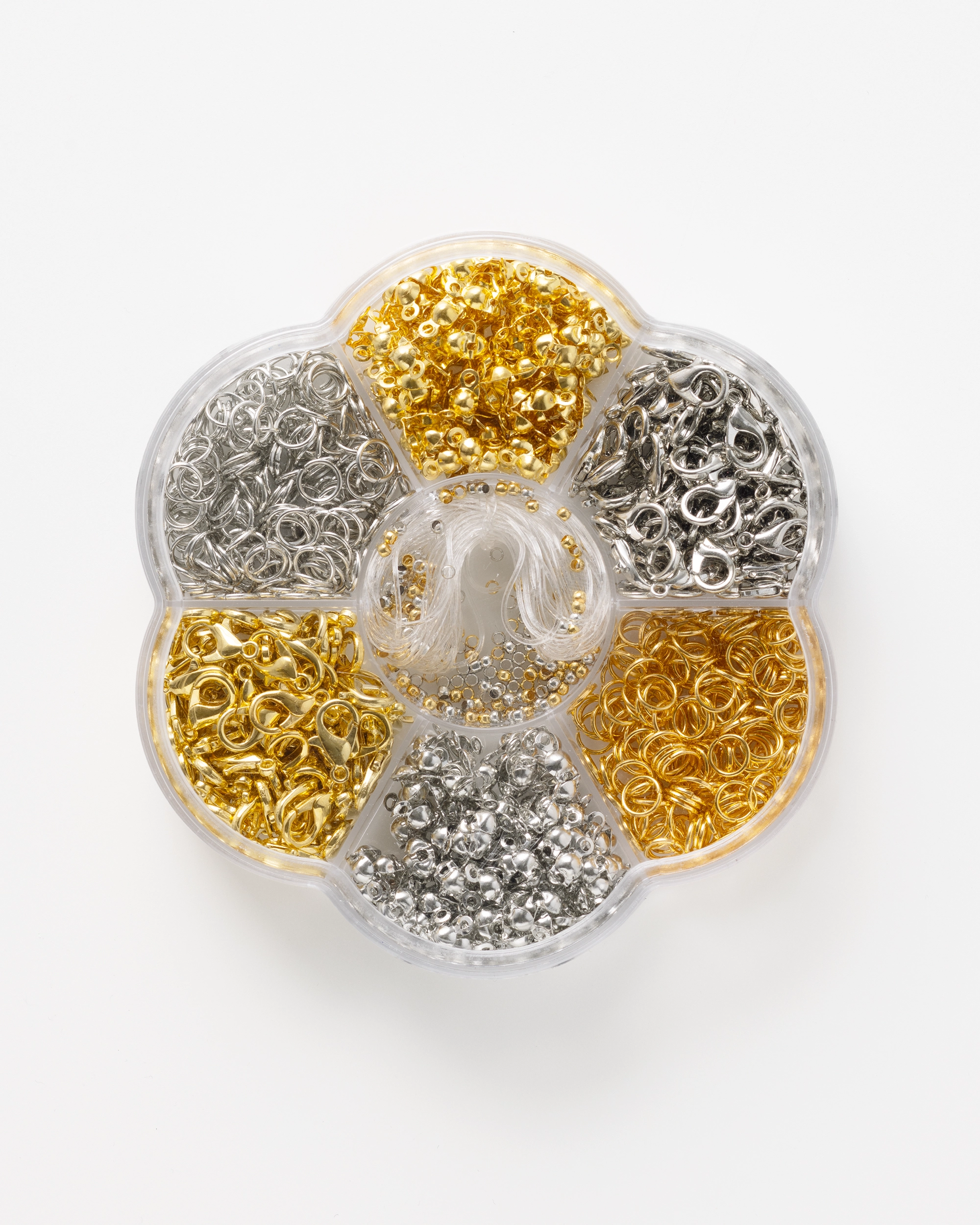 This jewellery findings set knows how to deliver a clean finish. The nylon thread gets things started, crimp beads lock everything in place, and bead tips take care of the final touch – neat, clever and ready to connect. Jump rings link it all together, lobster clasps click shut. Done. Gold or silver? Both. No second guessing, no extra shopping – just get making.