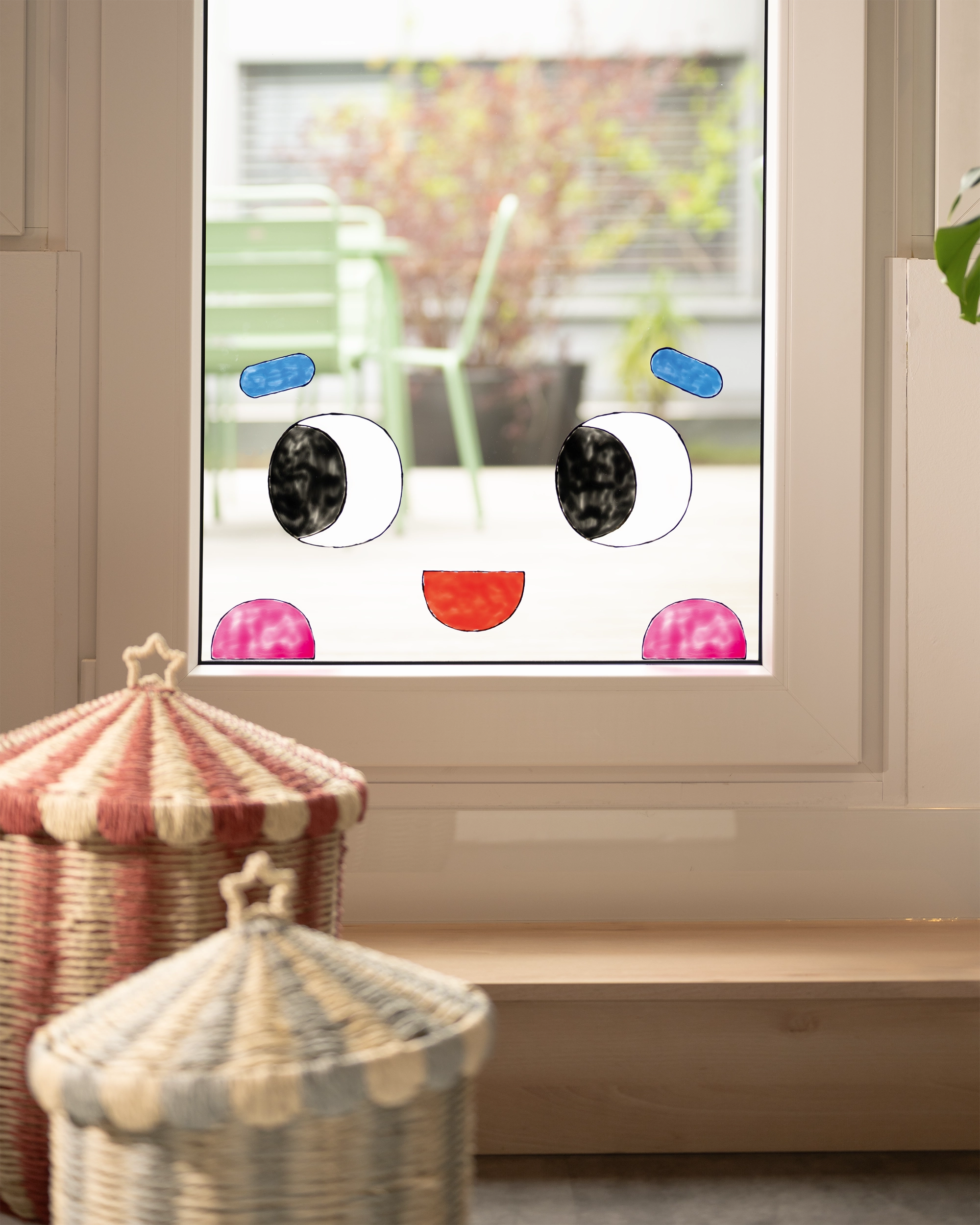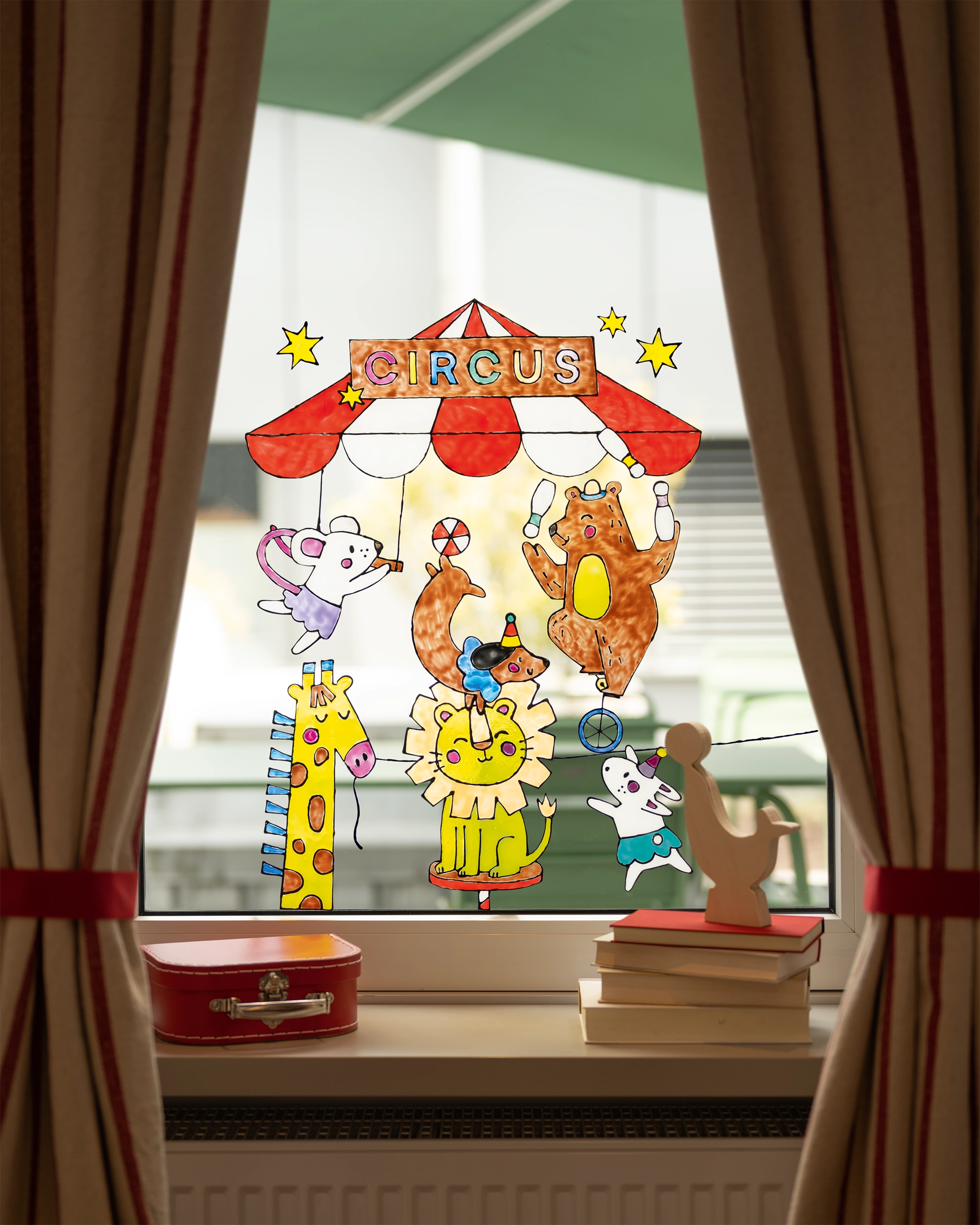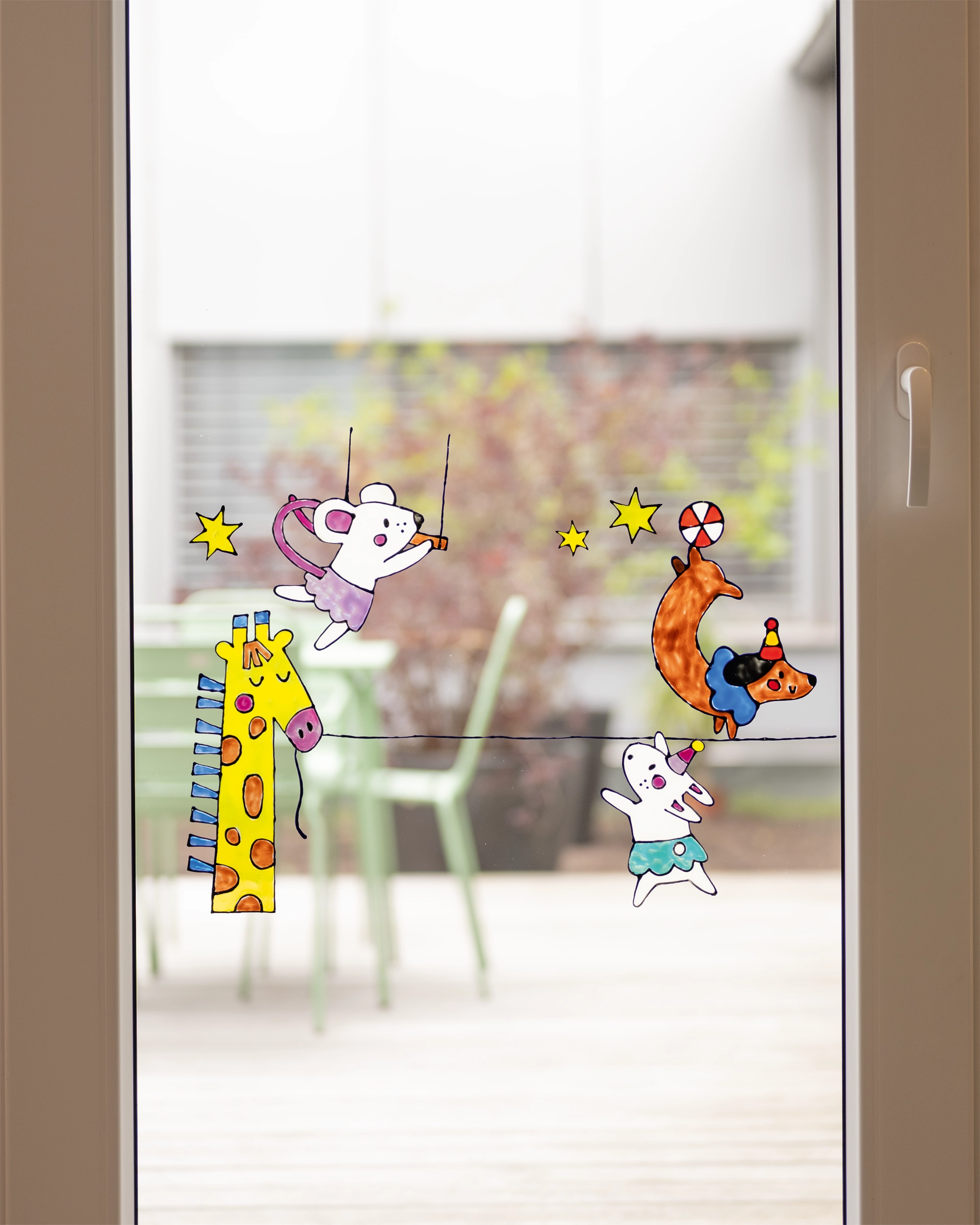 Whether colorful circus motifs or funny characters with big eyes—both designs can be combined beautifully and are real eye-catchers on any window pane. They are very easy to use: print out the template, place it under the transparent sheet, and trace the outlines. After a short drying time, color in the motifs and leave them to harden completely. Then you can carefully peel them off and place them directly on the window. This is a quick way to create little works of art that will delight children and adults alike.