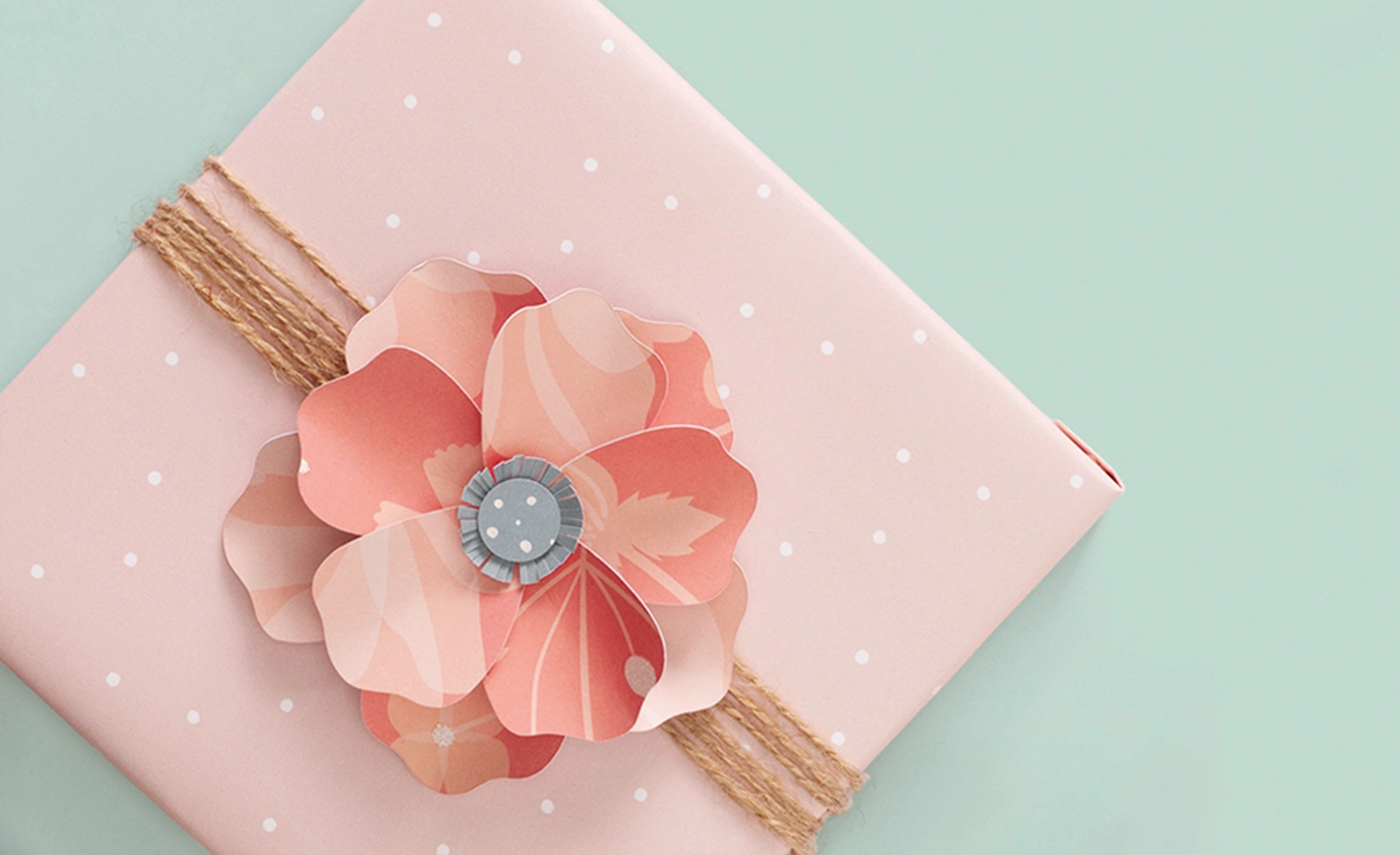 - Übertrage als Nächstes die Vorlage für die Blumen auf dein Motivpapier und schneide diese aus. Wir haben für unseren Kranz 3 kleine und 1 große Blüte gebastelt. Auch hier erzielst du einen schönen Effekt, wenn du mit dem Falzbein in der Mitte der Blumenblätter eine Rille ziehst. Die Falz-Stellen haben wir dir in der Vorlage mit einer gestrichelten Linie markiert.