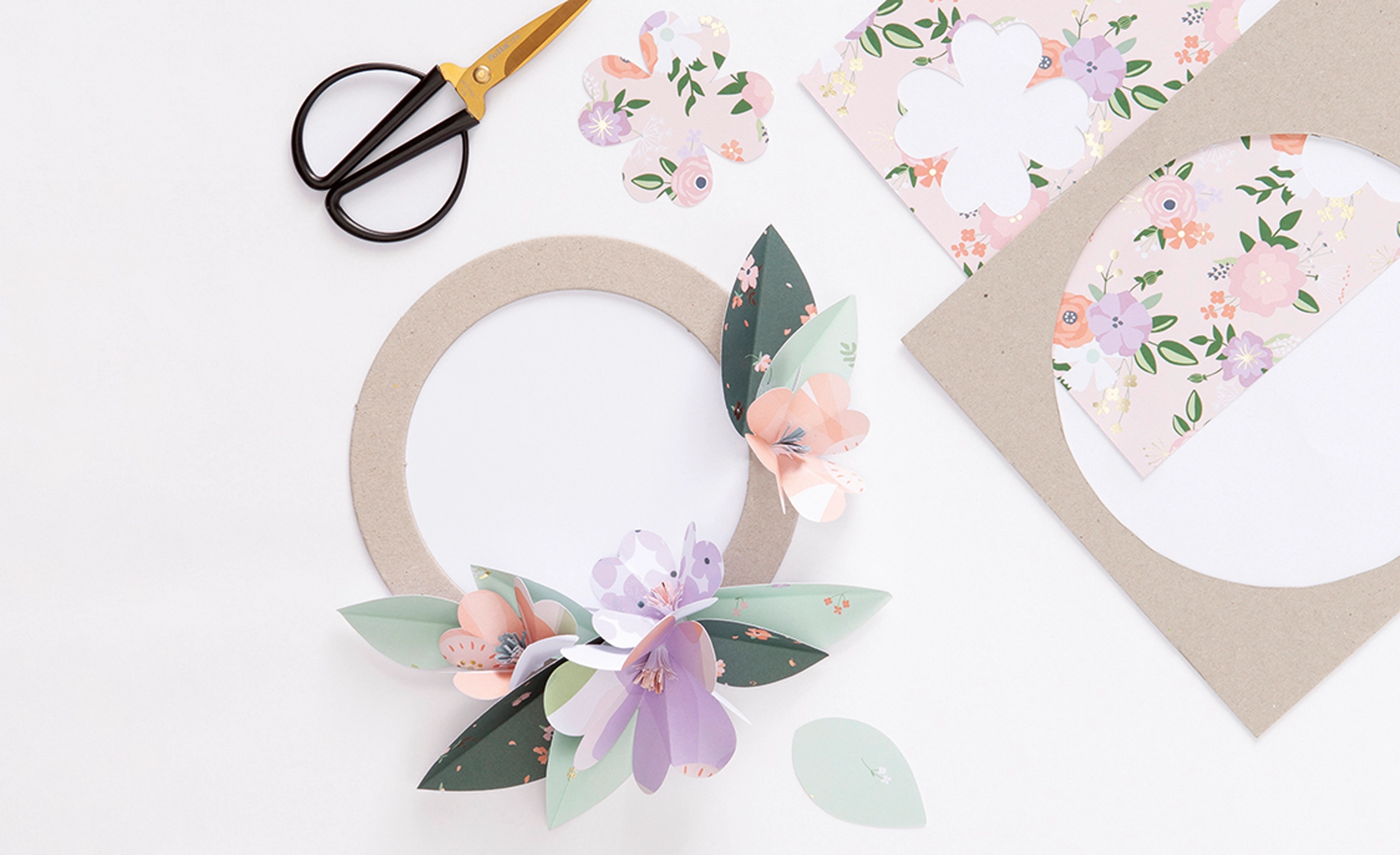 - Bestreiche nun die Innenseite mit Bastelkleber und rolle das Papier ein. Anschließend klebst du den fertigen Stempel in die Mitte deiner Blüte. Nun kannst du deine Blüten und Blätter auf dem Kranz nach deinem Geschmack arrangieren und auf deinen Ring kleben.